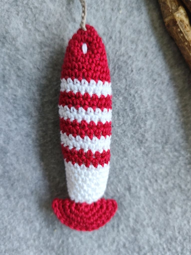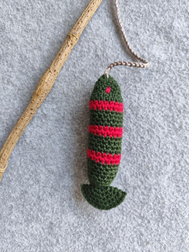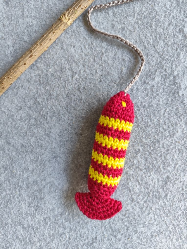 Canne à pêche en bois avec une sardine en crochet au bout.
